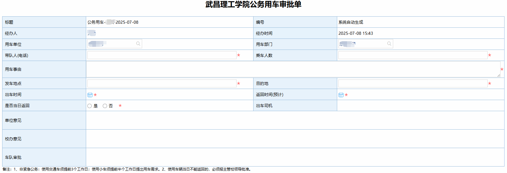 (1)如果办理不是当前所在部门业务,注意修改申请单位和申请部门。