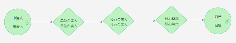 申请人(申请为老师)-单位负责人(学院院长或部门处长)-学校校办负责人-学校校办备案-归档。