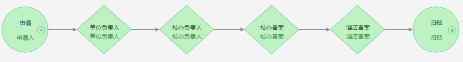 申请人(申请为老师)-单位负责人(学院院长或部门处长)-学校校办负责人-学校校办备案-酒店备案-归档。