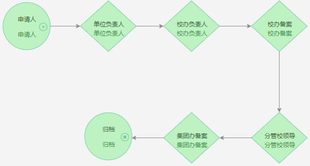 申请人(申请为老师)-单位负责人(学院院长或部门处长)-学校校办负责人-校办备案-分管领导-集团办备案-归档。