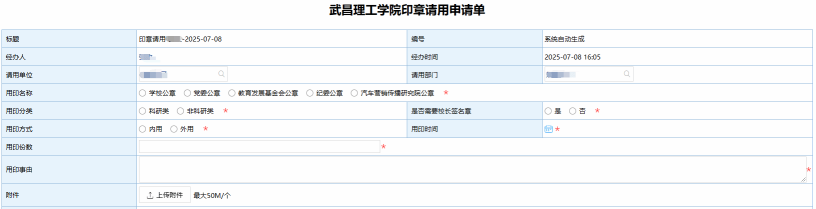 (1)如果办理不是当前所在部门业务,注意修改申请单位和申请部门。