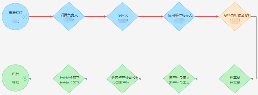 申请验收(申请为老师)-项目负责人-使用人-使用单位负责人(学院院长或部门处长)-资料员验收(学校资产处资料员)-学校档案员-学校资产处负责人-分管资产处副校长-上传校长签字(申请人打印流程递交校长签字,再扫描校长签字文件,上传扫描文件)-归档。