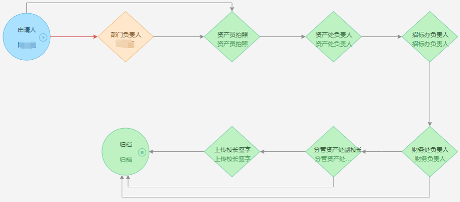 (1)预算金额<1万元:申请人(申请人为学校老师)-单位负责人(学院院长或部门处长)-资产员拍照(学校资产处资产员)-学校资产处负责人-集团招标办负责人-财务处负责人-归档。