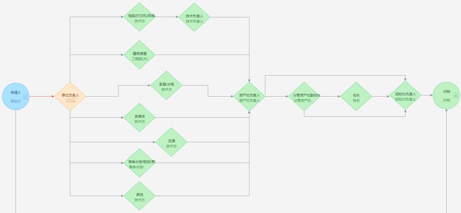(A)维修类型为电脑/打印机/网络/电话/网站:申请人(申请人为学校老师)-单位负责人(学院院长或部门处长)-技术方(智能化办公室)-学校资产处负责人-集团招标办负责人-归档。